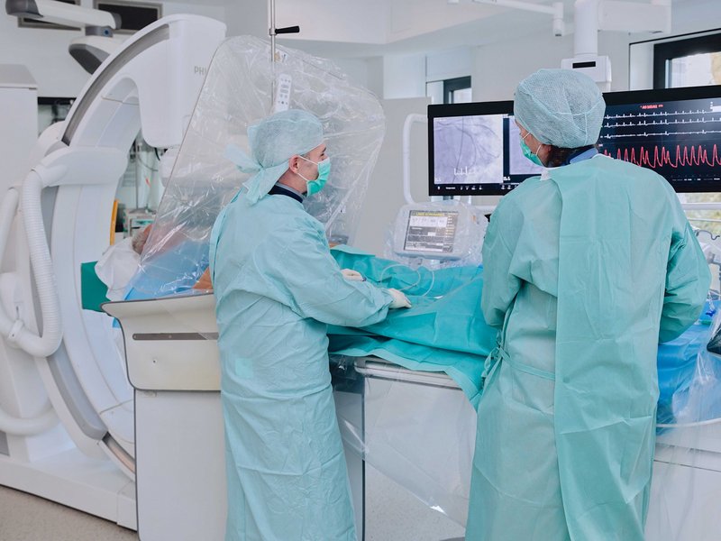 Die invasiven Verfahren werden im Herzkatheter-Labor durchgeführt. Dort erfolgt die Darstellung der Gefäße wie auch, sofern erforderlich und möglich, die Gefäßbehandlung. Darüber hinaus werden dort Herzschrittmacher-und Defibrillator-Implantationen durchgeführt
