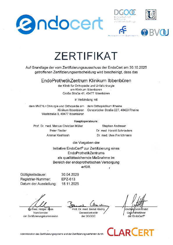 Der Einsatz eines neuen Hüft- oder Kniegelenks gehört in Deutschland zu den häufigsten Eingriffen. Mit unserem zertifizierten EndoProthetikZentrum sind wir für alle Arten der Endoprothetik Anlaufstelle. Das Zentrum in Ibbenbüren ist die Summe von drei Kooperationsbeteiligten: die Klinik für Unfallchirurgie und Orthopädie am Klinikum Ibbenbüren, das MVZ für Chirurgie und Orthopädie am Klinikum Ibbenbüren und das Orthopädikum Rheine. Gemeinsam bieten wir Ihnen eine Rundumbehandlung von der Beratung bis hin zur Rehabilitation für Ihre Lebensqualität.